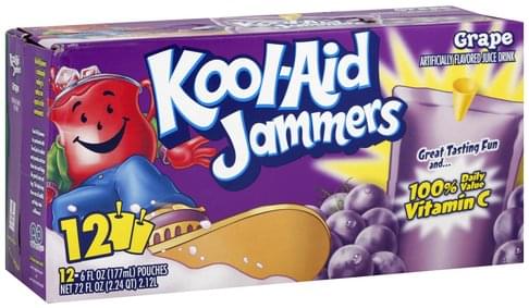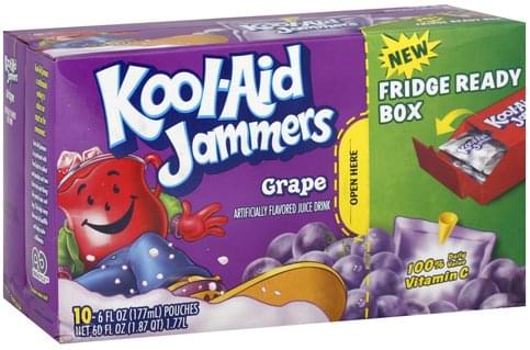Calories in Kool-Aid Grape Jammers and Nutrition Facts - FatSecret Nutrition Facts Serving Size 1 pouch (177 ml) Amount Per Serving Calories 30 % Daily Values* Total Fat 0.00g 0% Saturated Fat - Trans Fat - Cholesterol 0mg 0% Sodium 15mg 1% Total Carbohydrate 8.00g 3% Dietary Fiber 0.0g 0% Sugars 8.00g Protein 0.00g Vitamin D - Calcium - Iron - Potassium -