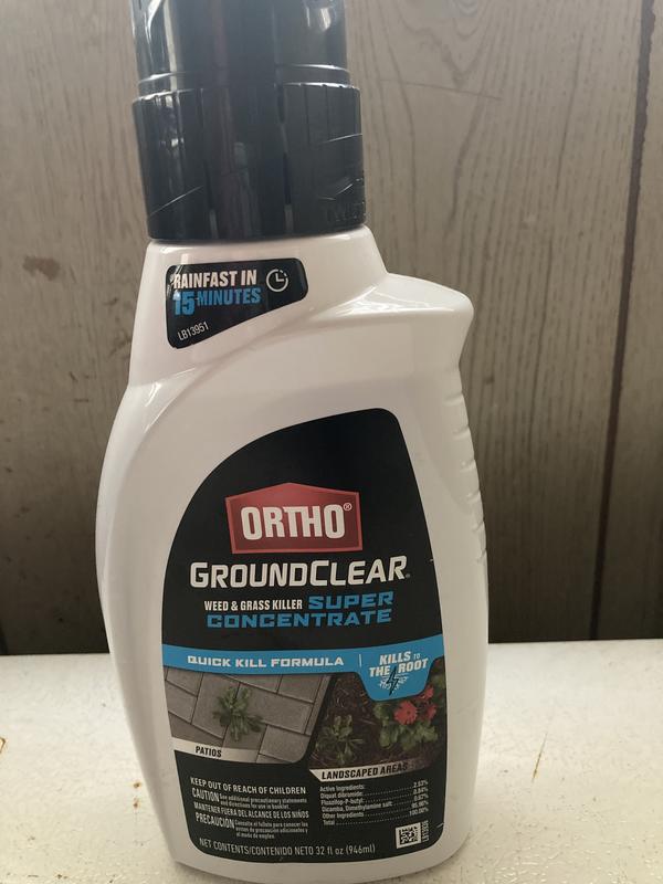 Ortho GroundClear Weed Killer - Don't Waste Your Money Ortho GroundClear Year Long Vegetation Killer1 is formulated to kill weeds and grasses and prevent new growth for up to 1 year. To use this concentrate, simply mix 24 fl. oz. with 1 gallon of water in a tank sprayer. Use on areas where weeds are not desired, including driveways, sidewalks, gravel areas, rock and desert landscapes, under decks ... Ortho® GroundClear® Weed & Grass Killer Super Concentrate Apply this concentrated formula with a tank sprayer, following dilution directions. Apply around landscape areas, patios, walkways and driveways. Sprayed weeds usually begin to wilt within hours after application, with weeds completely killed within days to 1-2 weeks. A single application controls most listed weeds.