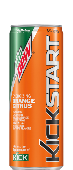Mtn Dew® Kickstart™ Orange Citrus - MTN DEW® Orange Citrus. MTN DEW ® KICKSTART ™ Orange Citrus combines the great taste of DEW ® with real fruit juice and just the right amount of kick to start your day. Juice + Caffeine + DEW ®. Store Locator. Buy Online. Nutrition Info. Mtn Dew ® Kickstart ™ Pineapple Orange Mango.