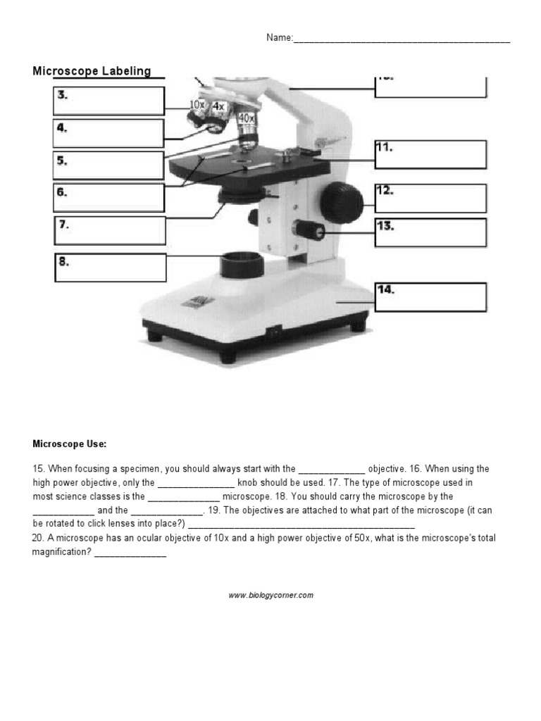 Microscope Labeling - The Biology Corner Microscope Labeling Microscope Use: 15. When focusing a specimen, you should always start with the _____________ objective. 16. When using the high power objective, only the _______________ knob should be used. 17. The type of microscope used in most science classes is the ______________ microscope. 18.