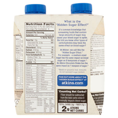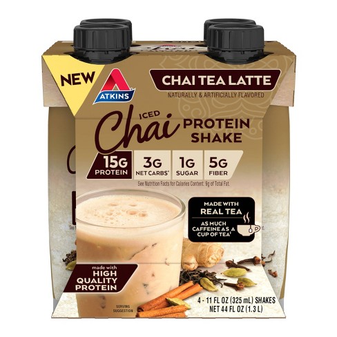 Atkins Protein Shake - Mocha Latte - 4ct : Target Each delicious Mocha Latte Shake is packed with 15g of protein, 4g net carbs, 1g of sugar and 5g of fiber to keep you satisfied. Atkins shakes give you steady energy throughout the day, so they are the perfect meal replacement or complement to your workout routine. Atkins Mocha Latte Shake, 11 fl oz, 4-Pack.