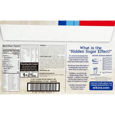 Atkins Nutritional Shake - Milk Chocolate Delight : Target Description. Enjoy Atkins Milk Chocolate Delight Protein-Rich Shakes! Each delicious Milk Chocolate Delight Shake is packed with 15g of protein, 2g net carbs, 1g of sugar and 5g of fiber to keep you satisfied. Atkins shakes give you steady energy throughout the day, so they are the perfect meal replacement or complement to your workout routine.
