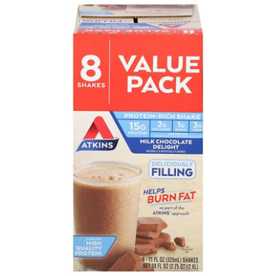 Atkins Milk Chocolate Delight Shake 4 pk - H-E-B 11 oz. $7.19 ($1.80/ct) Icon details. Product description. Delicious, creamy milk chocolate flavor offers an optimal mix of protein and essential vitamins and minerals with only 1g of sugar. Preparation instructions. Shake well. Best served chilled. Important: Must be refrigerated after opening to maintain safety. All Atkins Shakes | Atkins Atkins Shakes Sweet and creamy Atkins® Shakes make for a great meal or snack with protein to help keep you satisfied throughout the day as well as calcium, and essential vitamins and minerals Where to Buy » Shop Now » Military veteran, service member or first responder? Receive 15% off bars and shakes every day!