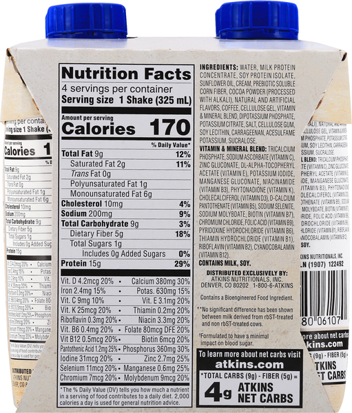 Atkins Protein Shake, 4pk - CVS Pharmacy | CVS.com Serving Size: 11 fl oz Servings Per Container: 4 Nutrient Amount per Serving % Daily Value Calories Calories from Fat Total Fat Saturated Fat Cholesterol Sodium Potassium Total Carbohydrate Dietary Fiber Sugars Protein Vitamin A Vitamin C Calcium Iron Flavor Vitamin D Vitamin E Biotin Chromium Folate Iodine Magnesium Manganese Molybdenum Niacin