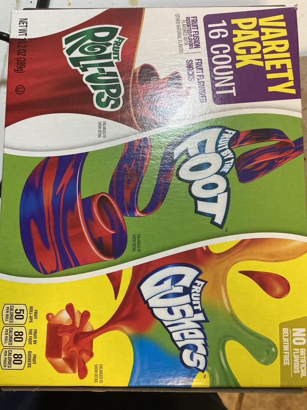 Fruit Snacks Gushers Mega Pack Variety Pack 20 Pouches 0.9 oz Each ... On-the-go snack: 90 calories per pouch; these individual snacks are the perfect addition to any day out; Box contains: 1 box, 20 total pouches of Strawberry Splash and Tropical Gushers kids' snacks; Fruit Gushers variety pack with 0.5g of saturated fats; Box Tops for Education on every box
