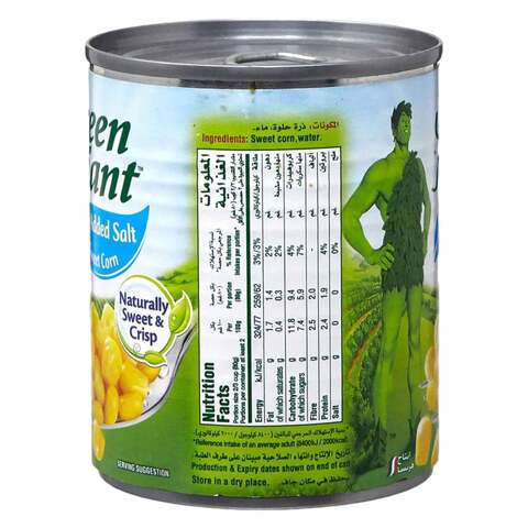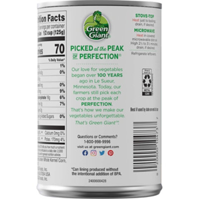 Green Giant® Whole Kernel Sweet Corn 15.25 oz. Green Giant® Whole Kernel Sweet Corn 15.25 oz. Our vegetables are Picked At The Peak Of Perfection™ and conveniently packed so you can have the fresh taste of Green Giant® vegetables year-round. Where To Buy Product Information Ingredients Golden Whole Kernel Corn, Water, Salt. FIND A STORE Recipe Suggestion: Homemade Classic Cornbread View Recipe