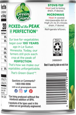 Green Giant Whole Kernel Sweet Corn, 4 Pack of 15.25 Ounce Cans Green Giant canned vegetables are also canned near the farms where they are harvested. ... They are a bit crisper than generic label canned beans, not overcooked. Not salty. There were no rocks, twigs or vines like are often found in cheap brands. ... Information and statements regarding dietary supplements have not been evaluated by the Food ...