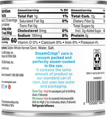 Green Giant Steam Crisp Corn Extra Sweet Niblets - Giant Food Nutrition 60 Calories 0g Sat Fat 190mg Sodium 5g Sugars Nutrition Facts About 3.5 servings per container Serving Size 0.5 cup Amount per serving Calories 60 % Daily Value* Total Fat 1g 1 Saturated Fat 0g 0 Trans Fat 0g Cholesterol 0mg 0 Sodium 190mg 8 Total Carbohydrate 12g 4 Dietary Fiber 2g 7 Total Sugars 5g Includes 0g Added Sugars 0 Protein 2g
