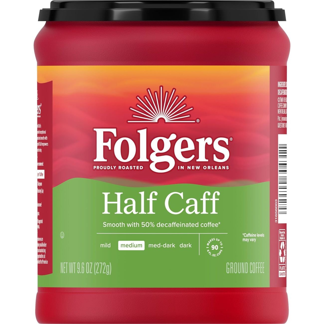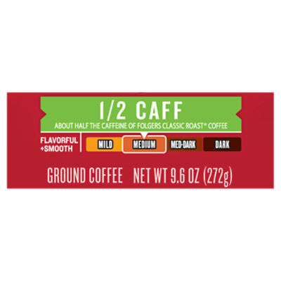 Folgers Half Caff Ground Coffee, Medium Roast, 22.6-Ounce Contains one (1) 22.6-ounce canister of Folgers Half Caff Ground Coffee. A flavorful and smooth coffee with the pure flavor and classic aroma you love. Carefully crafted by our experienced Roast Masters. contains about half the caffeine of Folgers Classic Roast coffee. Makes up to 210 suggested strength 6 fl oz servings per canister.