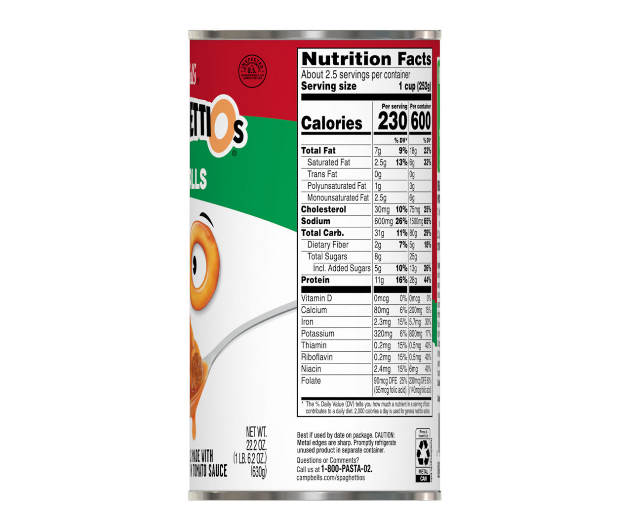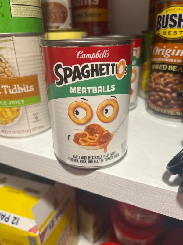SpaghettiOs® with Meatballs - Campbells Food Service Campbell's® SpaghettiOs® with Meatballs is a delicious and filling fun-shaped pasta dish that includes 9 grams of protein and 20% of daily vegetables per 1 container. Enjoy the neat round spaghetti you can eat with a spoon - a pantry staple for generations! Features And Benefits Shaped pasta in a delicious tomato and cheese sauce SpaghettiOs Meatballs, 10 Ounce (Pack of 24) - Amazon.com Product details. Package Dimensions : 19.1 x 12.6 x 4.1 inches; 14 Ounces. Item model number : 200000022436. Manufacturer : Campbell Soup Company. ASIN : B011EWVTXE. Best Sellers Rank: #120,646 in Grocery & Gourmet Food ( See Top 100 in Grocery & Gourmet Food) #668 in Packaged Pasta & Noodle Dishes. SPAGHETTIOS, SpaghettiOs A to Z's with Meatballs Nutrition Facts 100 grams of SPAGHETTIOS, SpaghettiOs A to Z's with Meatballs contain 95 calories, the 5% of your total daily needs. 100 grams of SPAGHETTIOS, SpaghettiOs A to Z's with Meatballs contain 12.7 grams of carbohydrates, 1.6 grams of fiber, 4.37 grams of protein, 238 milligrams of sodium, and 78.1 grams of water Spaghettios with meatballs : nutrition - reddit If I empty a can of spaghettios with meatballs into a colander and rinse off all the sauce, roughly how much sodium is left? With sauce a 15oz can … Press J to jump to the feed.