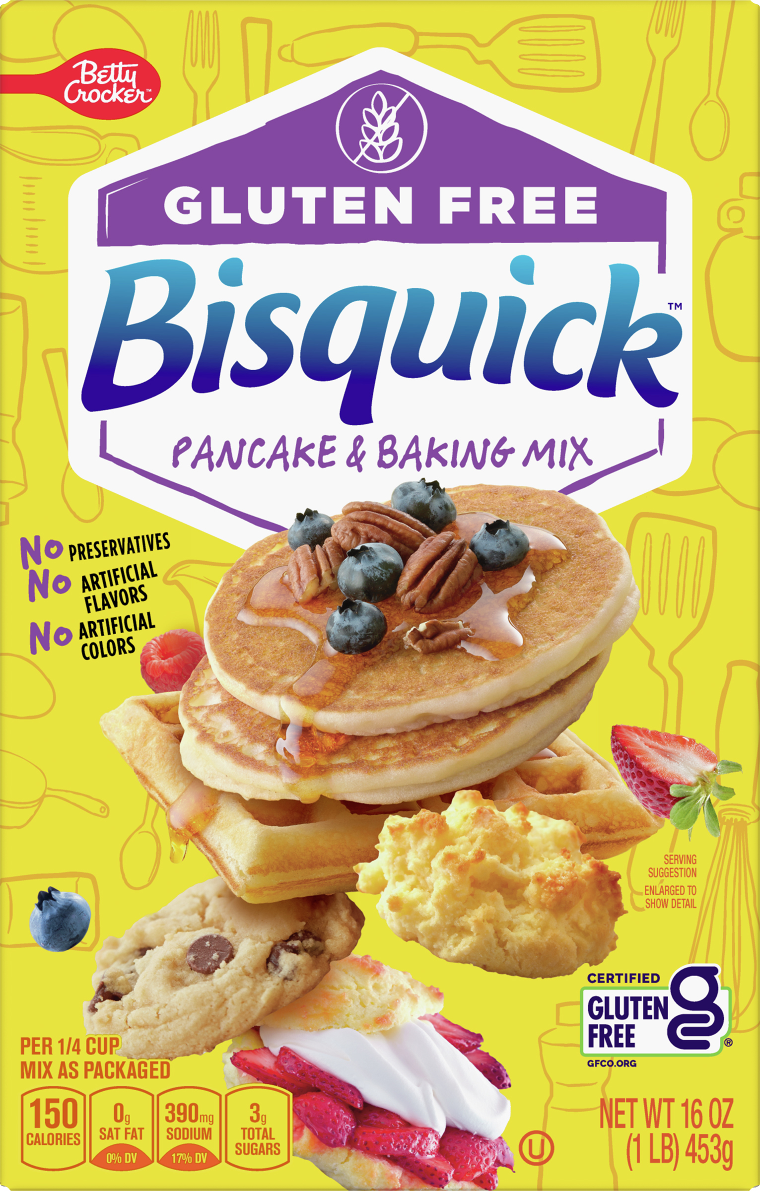 Bisquick™ Original Pancake & Baking Mix - BettyCrocker.com INGREDIENTS: This all-purpose baking mix contains no artificial flavors and no artificial colors ENDLESS OPTIONS: Personalize your breakfast favorites with fruits, nuts or chocolate chips BOX CONTAINS: 40 oz. box makes about 60 pancakes (431) (7) Advertisement Ingredients