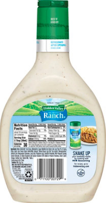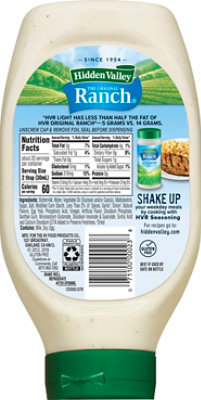 Hidden Valley Ranch Dressing Nutrition Label - Dining Services INGREDIENTS: BUTTERMILK 1/2 GAL (Cultured Nonfat Milk, Cream, Contains 2% or Less of: Nonfat Milk, Modified Food Starch-Corn, Mono & Diglycerides, Calcium Sulfate, Locust Bean Gum, Polysorbate 80, Carrageenan, Salt, Sodium Citrate, Vitamin A Palmitate, Vitamin D3), MAYONNAISE (Soybean Oil, Egg Yolk, High Fructose Corn Syrup, Water, Distilled … Hidden Valley Light Original Ranch Dressing - CalorieKing Calorie Breakdown. Where do the calories in Hidden Valley Light Original Ranch Dressing come from? 15.2% 79.7% 5.1% Total Carbohydrate Total Fat Protein 40 cal. Hidden Valley Original Ranch Salad Dressing & Topping Description. Toss Hidden Valley Original Ranch Dressing with greens, pasta and more for an easy, delicious side dish or meal. RANCH DONE RIGHT: Now even creamier and thicker, making it the perfect condiment for dipping, dunking or drizzling with pizza, wings and more. GLUTEN FREE: Perfect for school lunches or backyard BBQs this classic gluten ... Original Ranch ® Dressing, Dip & Sauce Mix - Hidden Valley Kitchens Ingredients:Salt, Monosodium Glutamate, Garlic*, Modified Corn Starch, Spices, Onion*, Maltodextrin, Less Than 2% Of: Natural Flavor, Guar Gum, Calcium Stearate. *Dried Contains:Milk, Soy For Nutrition Facts, See Back Panel: Specifications X Hidden Valley®Original Ranch®Dressing, Dip & Sauce Mix 18/3.2 oz. Institutional
