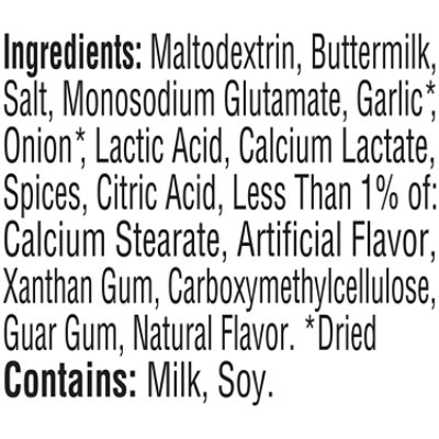 Original Ranch ® Seasoning Blend Canister - Hidden Valley Kitchens Ingredients, Nutrition & Allergen Info X Ingredients:Maltodextrin, Buttermilk, Salt, Monosodium Glutamate, Garlic*, Onion*, Lactic Acid, Calcium Lactate, Spices, Citric Acid, Less Than 1% Of: Calcium Stearate, Artificial Flavor, Xanthan Gum, Carboxymethylcellulose, Guar Gum, Natural Flavor. *Dried Contains:Milk, Soy